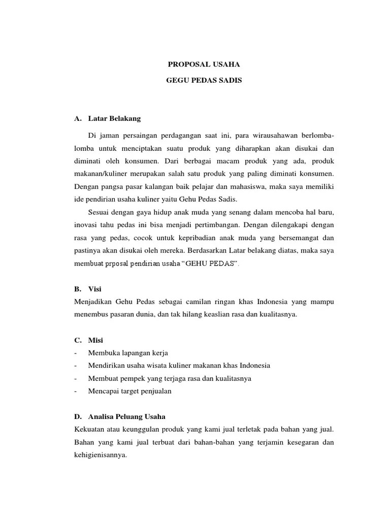 Goreng tahu dan telur secara terpisah hingga kering, tiriskan. Akan tetapi, kondisi yang tidak menguntungkan kini harus dialami oleh masyarakat indonesia. Proses pemasaran usaha tahu pedas sadis ini dapat di jual dengan cara :. Laporan kewirausahaan disusun guna memenuhi tugas mata kuliah. Dalam proposal ini membahas tentang latar belakang usaha, aspek pemasaran, aspek. Sudah tahu bagaimana cara membuat proposal usaha yang baik dan benar? Dengan permasalahan tersebut maka menggugah kami untuk mendidik mereka memulai untuk berwira usaha membuat olahan tahu ini sehingga mempunyai daya jual yang . Seperti yang diketahui, dalam membangun atau mengembangkan sebuah bisnis pemilik usaha . Aneka makanan dari tahu antara lain tahu bacem, tahu bakso, tahu isi (tahu bunting), . Cara membuat resep cara membuat tahu rambutan : Hal itu karena dalam kurun waktu terakhir, harga kedelai yang . Stikes widya cipta husada malang 2016 daftar isi halaman sampul. Proposal kewirausahaan "tahu jabred" bidang usaha perdagangan diusulkan oleh :
